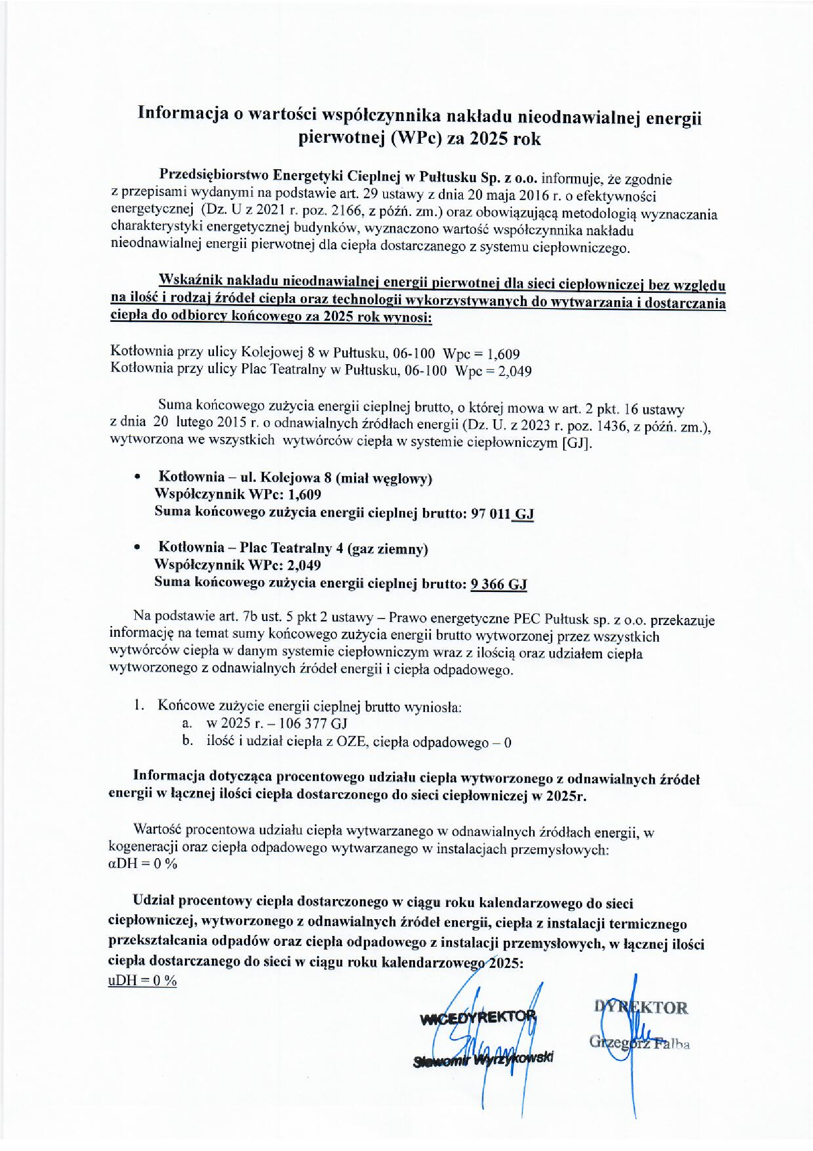 Informacja o wartości współczynnika nakładu nieodnawialnej energii pierwotnej (Wpc) za 2025 rok.