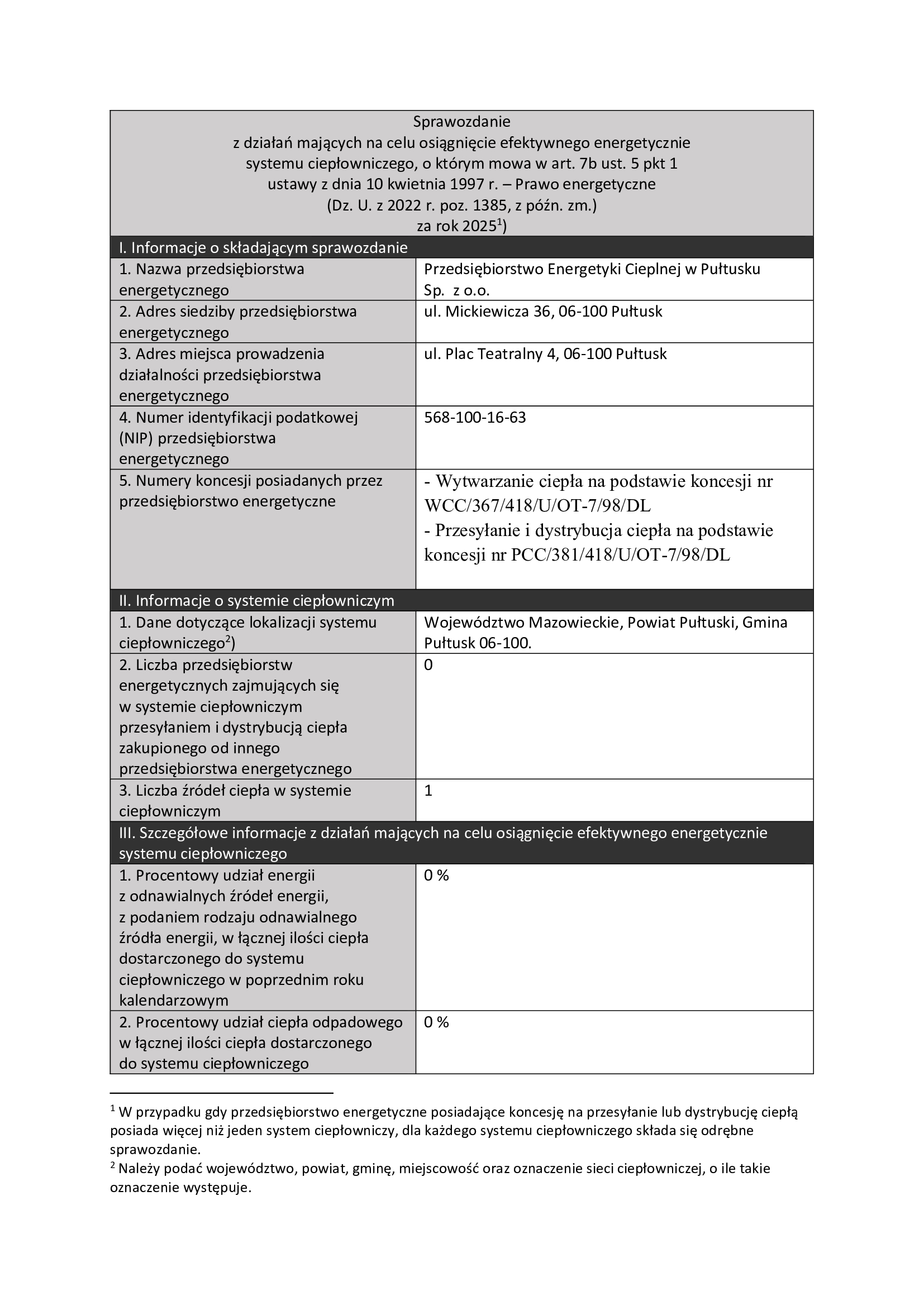 Sprawozdanie z działań mających na celu osiągnięcie efektywnego energetycznie systemu ciepłowniczego, o którym mowa w art. 7b ust. 5 pkt 1 ustawy z dnia 10 kwietnia 1997 r. - Prawo energetyczne (Dz. U. z 2022 poz. 1385, z późń. zm.) za rok 2025 dla źródła ciepła przy ulicy Plac Teatralny 4 w Pułtusku 06-100.