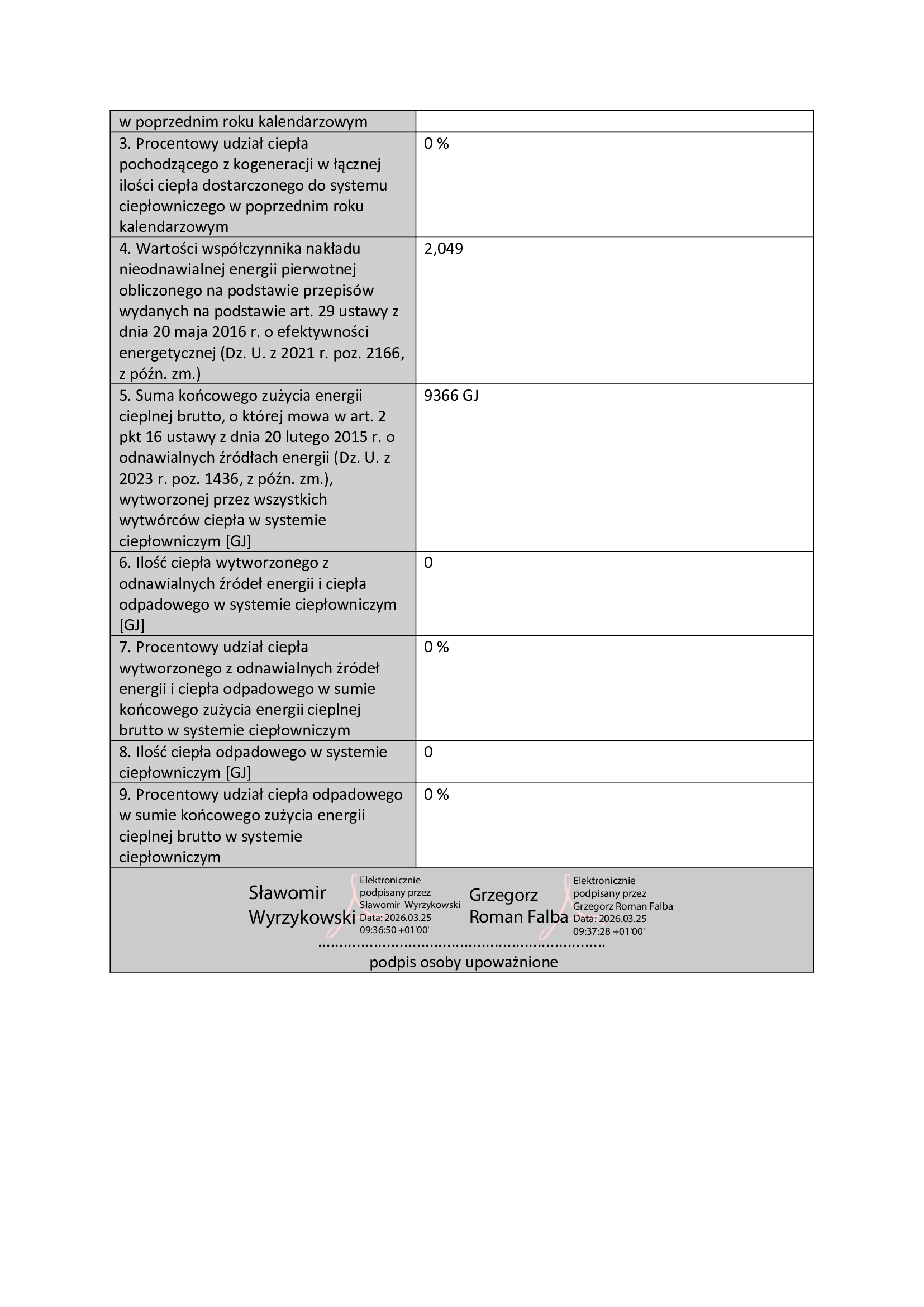 W załączeniu oświadczenie o podziale wykorzystywania ciepła dostarczonego do obiektu na potrzeby gospodarstwa domowego.